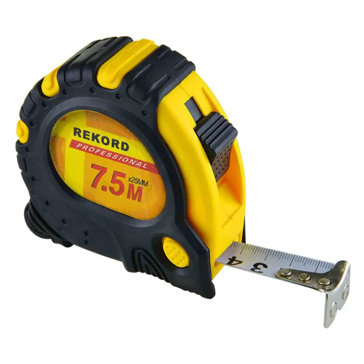 Рулетка строительная 7,5*25 мм "REKORD" – это простая, надёжная конструкция, защищенная ребристым резиновым элементом, предохраняющим корпус при падении.