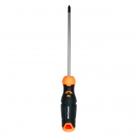 Отвертка шлицевая оснащена специально разработанной рукояткой из двухкомпонентного пластика с защитными упорами для пальцев, которые исключают скольжение. Стержень глубоко посажен в рукоятку и крепится в двух местах, что исключает срыв.