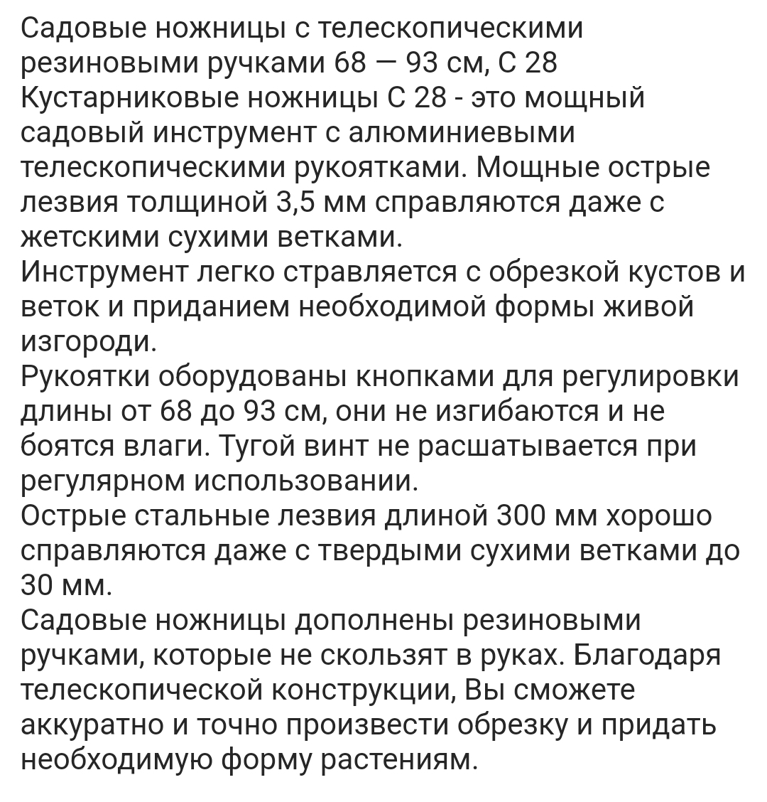 Садовые ножницы дополнены резиновыми ручками, которые не скользят в руках. Благодаря телескопической конструкции, Вы сможете аккуратно и точно произвести обрезку и придать необходимую форму растениям.