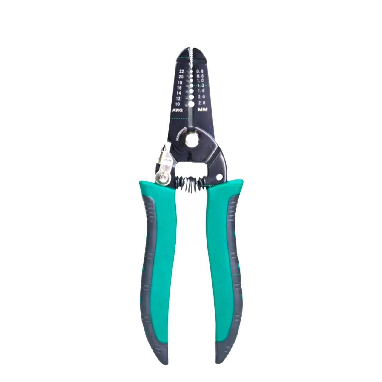 Стриппер для проводов 0,8 - 2,6 мм снабжен несколькими пазами для зачистки кабелей различного диаметра. Острые кромки пазов на губках инструмента обеспечивают быстрое и качественное снятие изоляции. В конструкцию инструмента включено приспособление для резки проводов. Нескользящие двухкомпонентные рукоятки оборудованы вставками из мягкой термопластрезины.