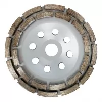 Чашка алмазная шлифовальная изготовлена из высокоуглеродистой стали. Диаметр шлифовальный чашки составляет 150 мм, посадочный диаметр – 22 мм. Чашка алмазная шлифовальная двурядная — это надежный, качественный и долговечный инструмент для профессионального использования.