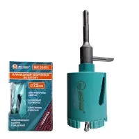 Коронка алмазная для сверления бетона в безударном режиме 72 мм – это узкоспециализированная насадка для перфоратора или дрели, позволяющая сделать отверстие или углубление в различных твердых материалах: ячеистом бетоне, пенобетоне, газосиликате, кирпиче и камне. Толщина твердосплавных зубьев 4,5 мм. Глубина коронки 80 мм. Сверло 100 мм.