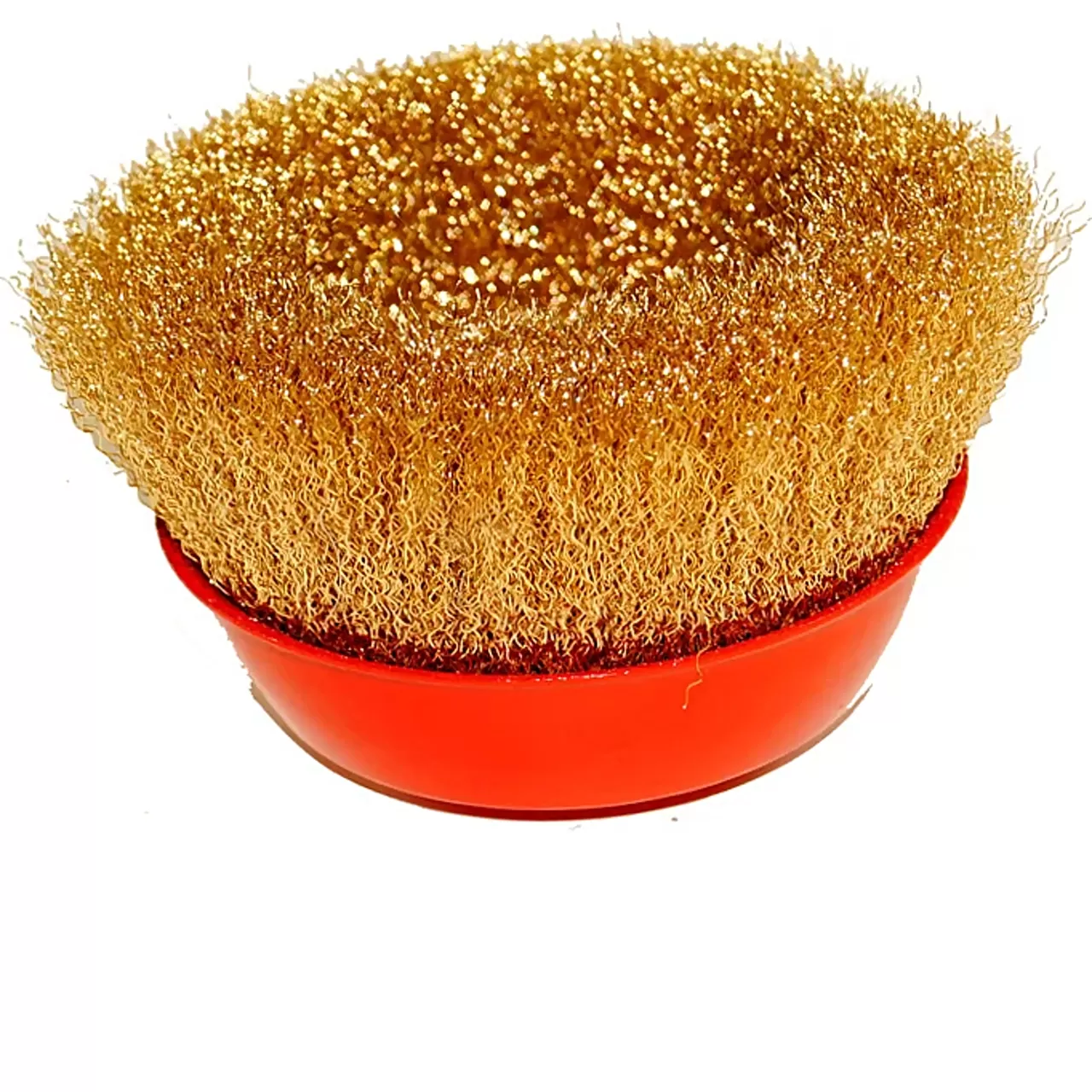 Щетка латунированная 125 мм для УШМ предназначена для зачистки изделий, удаления ржавчины и грязи с металлических поверхностей. Оснастка крепится к инструменту при помощи гайки М14.
